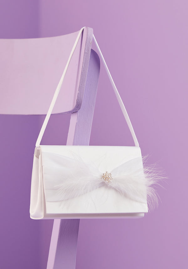 This a beautiful satin Holy Communion bag is decorated with pearls and trimmed with feathers